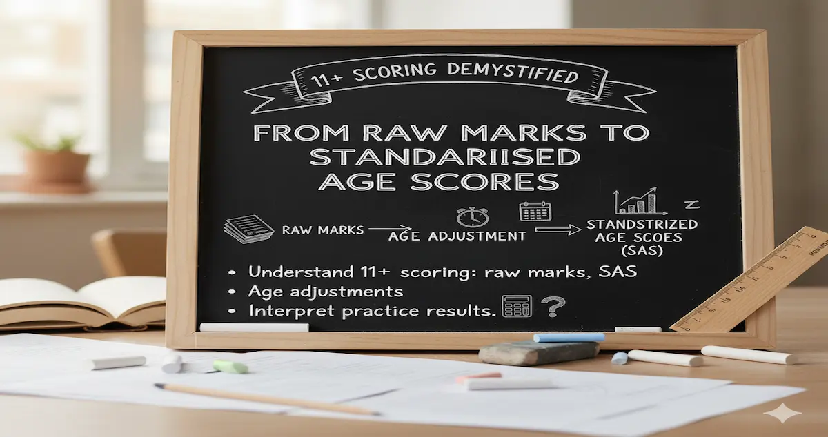 Understand 11+ scoring: raw marks, standardised age scores (SAS), age adjustments, and how to interpret practice results.